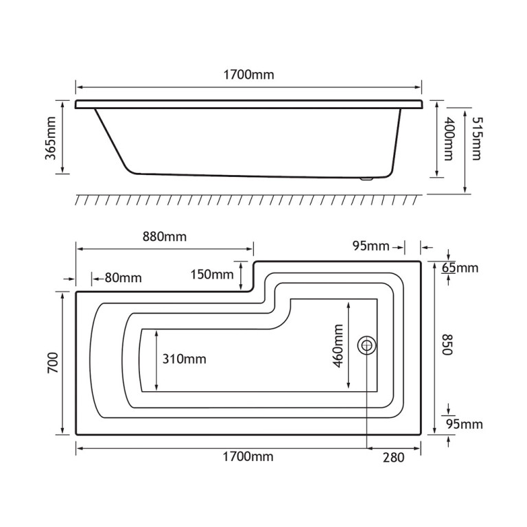 - Length: 1700mm, Width: 700mm, Internal depth: 400mm, Height: 515mm
