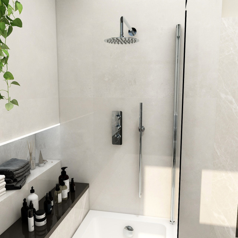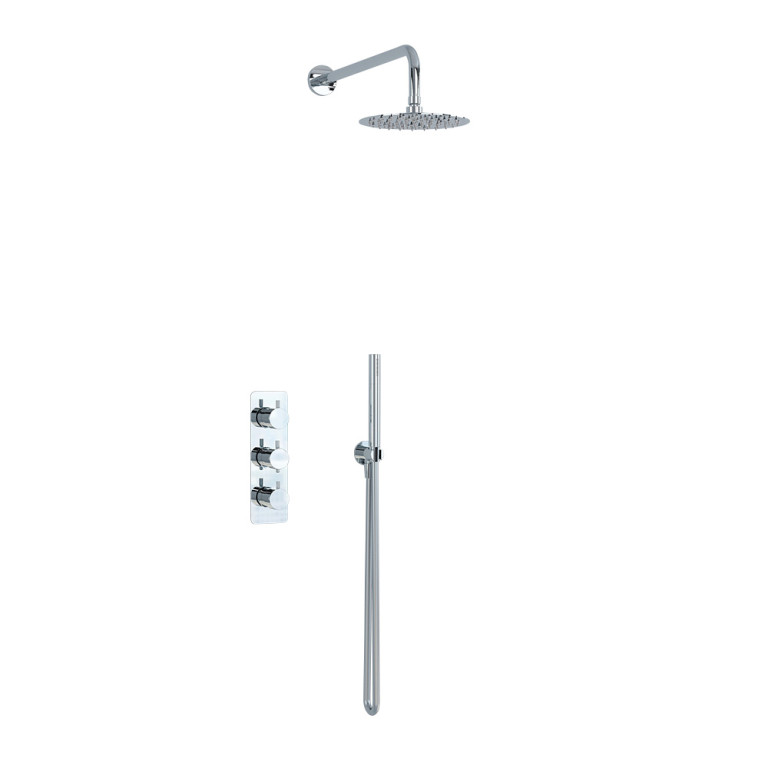 Ravine 3 handle, triple diverter concealed thermostatic valve with 200mm fixed head, pencil handset and smooth hose in Chrome