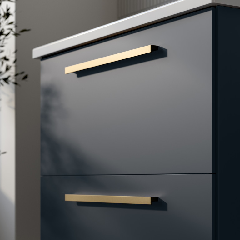Berwick is a versatile and stylish bathroom vanity that seamlessly blends aesthetics with functionality. Its design is characterised by sleek angled edges, a modern slim bar handle and a made-to-fit, white ceramic basin. The two large, smooth glide drawers, provide practical and convenient storage for towels, toiletries, and other bathroom essentials.